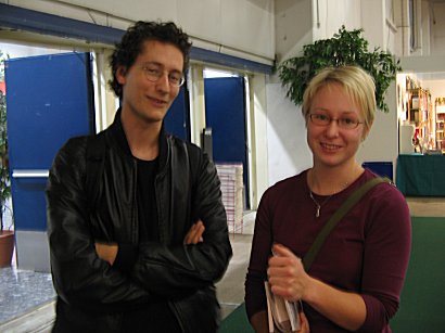 | Kirjamessut ovat, paitsi kirjanystävän tärkeä markkinapaikka, myös oivallinen tilaisuus törmätä tuttuihin. Tässä Mikaelin kanssa kokemuksia vaihtaa kirjallisuuslinjalta vuonna 2002 valmistunut Hanne. |