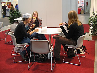 | Mikä hieno päivä tämä on ollutkaan! Kuulutuksissa neuvotaan jo poistumaan messukeskuksesta, mutta porukkamme istahti vielä nauttimaan välipalasta ja kertaamaan antoisan reissun kokemuksia. Messuille taas ensi vuonna, eikö niin? |